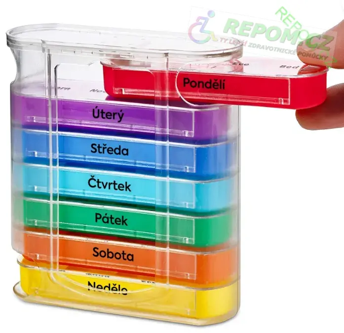 Praktický organizér je ideální pro častější dávkování léků díky svému patrovému uspořádání. Zásuvné přehrádky jsou umístěny nad sebou, což šetří místo a zároveň chrání léky před přímým slunečním světlem. Denní zásuvky jsou barevně rozlišeny a mají jasně označené dny v týdnu. Každá zásuvka je rozdělena na čtyři části: ráno, poledne, večer, noc a víčka jsou výrazně označena. Přihrádky na jednotlivé dny lze použít i samostatně, což je velmi praktické například při cestování.