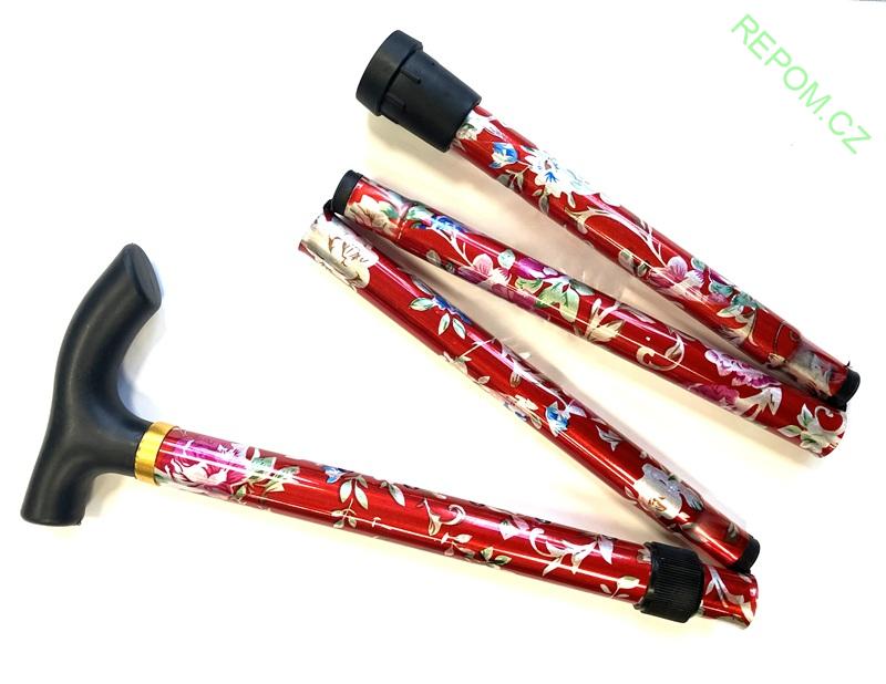 Levná vycházková hůl složitelná s ergonomicky tvarovaným madlem s květinovým designem
