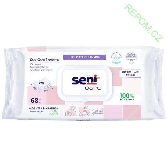Seni Care Sensitive vlhčené ubrousky jsou navrženy pro každodenní péči o citlivou a náchylnou pokožku. Díky pH 5,5 šetrnému k pokožce jemně čistí, zmírňují podráždění a zároveň hydratují. Obsahují výtažek z aloe, který zklidňuje a podporuje regeneraci pokožky, alantoin pro ochranu a hojení drobných podráždění a glycerín, který pokožku zvlhčuje a chrání před vysušením.